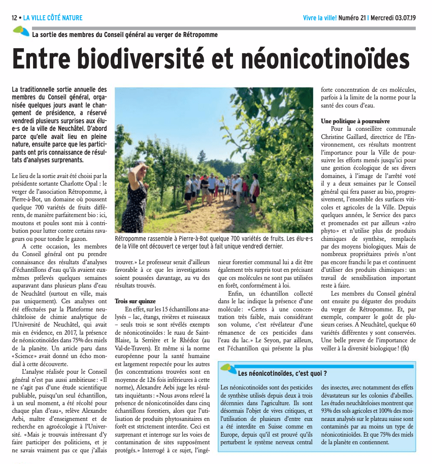 J’ai été invité à participer à la sortie annuelle du conseil général de la ville de Neuchâtel, sur le thème de l’agroécologie. L’organisatrice de l’événement voulait sensibiliser les membres du conseil à la problématique des pesticides, aussi j’ai eu l’idée de leur faire mettre la main à la pâte en collectant des échantillons dans le cours d’eau de leur choix. Nous avons ensuite analysé ces échantillons à l’aide de la plateforme neuchâteloise de chimie analytique. La majorité étaient contaminés! Un excellent article décrivant la démarche (et détaillant nos résultats) a été publié dans le journal “Vivre la ville”. Depuis, les échanges avec les services de la ville concernés vont bon train. Les suites à donner à ces résultas préliminaires commencent à se dessiner… Affaire à suivre!