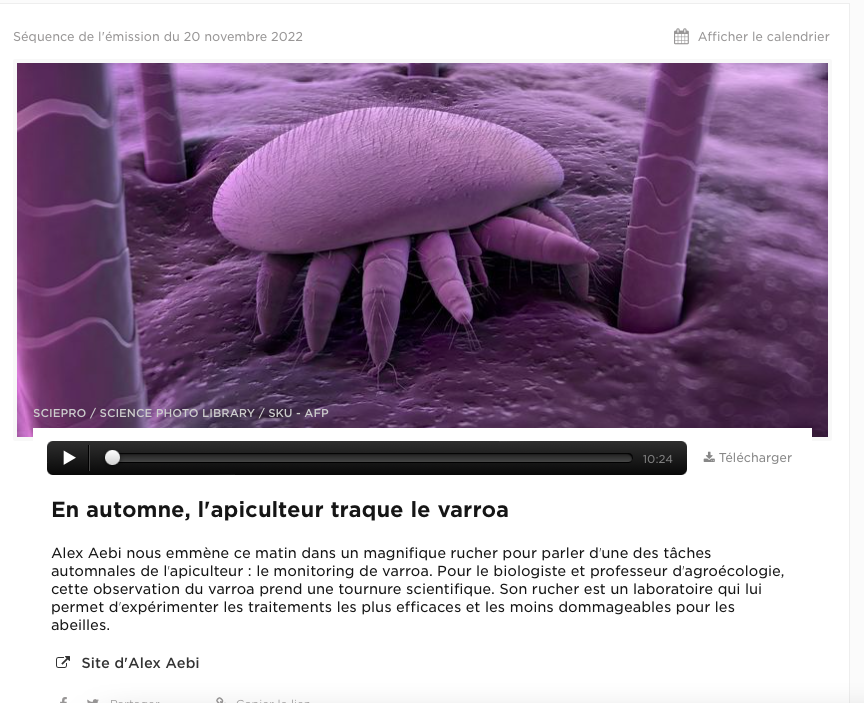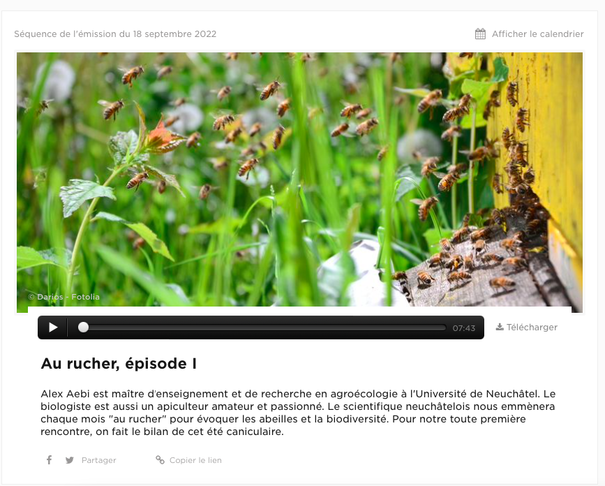 La RTS m’a fait l’honneur de m’offrir une chronique, dans le cadre de l’émission “côté jardin”, qui passe le dimanche matin. Je vais vous parler d’abeilles, du lien entre les abeilles le territoire qu’elles parcourent et avec celles et ceux qui y travaillent. Je vous parlerai aussi de biodiversité et des services qu’elle nous rend, à nous les êtres humains.
